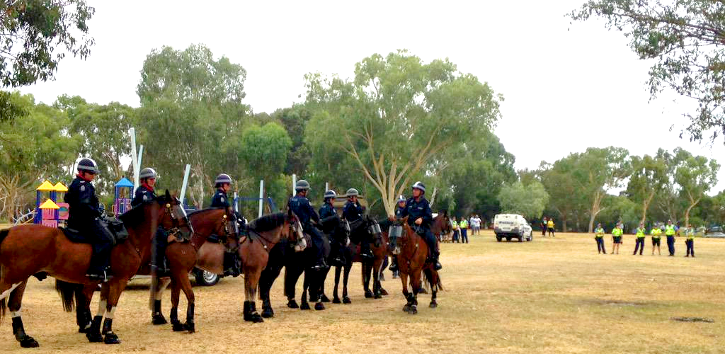 Police moved in to Matagarup (colonial name: Heirisson Island) yesterday, site of the Nyoongar Bibbulman Tent Embassy in Perth (Western Australia) — some fifty police, including a line of mounted police and dogs.